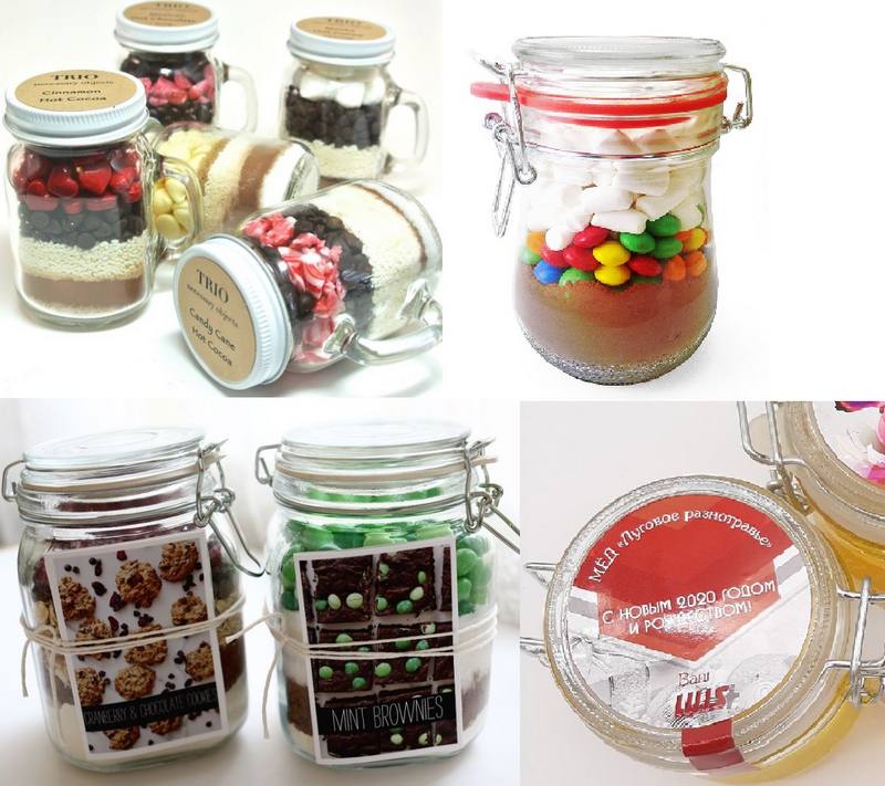 Прозрачные стеклянные банки могут быть разных размеров, с ручками и без ручек. Брендировать баночки можно наклейками с полноцветной печатью, открытками. Кроме того, вдобавок к банкам можно сделать деревянные коробки, в которые будут находиться эти банки.